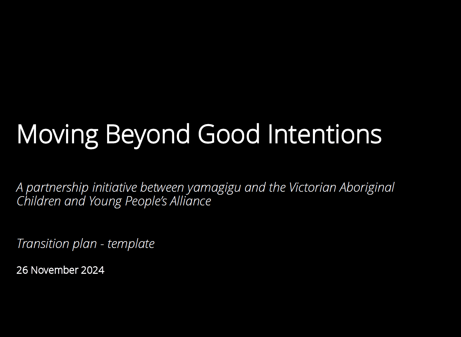 Beyond Good Intentions - A sample transition plan agreement template developed by yamagigu and the Victorian Aboriginal Children and Young People’s Alliance (VACYPA) to establish approach, timelines, actions, roles and responsibilities for transition of foster care services.