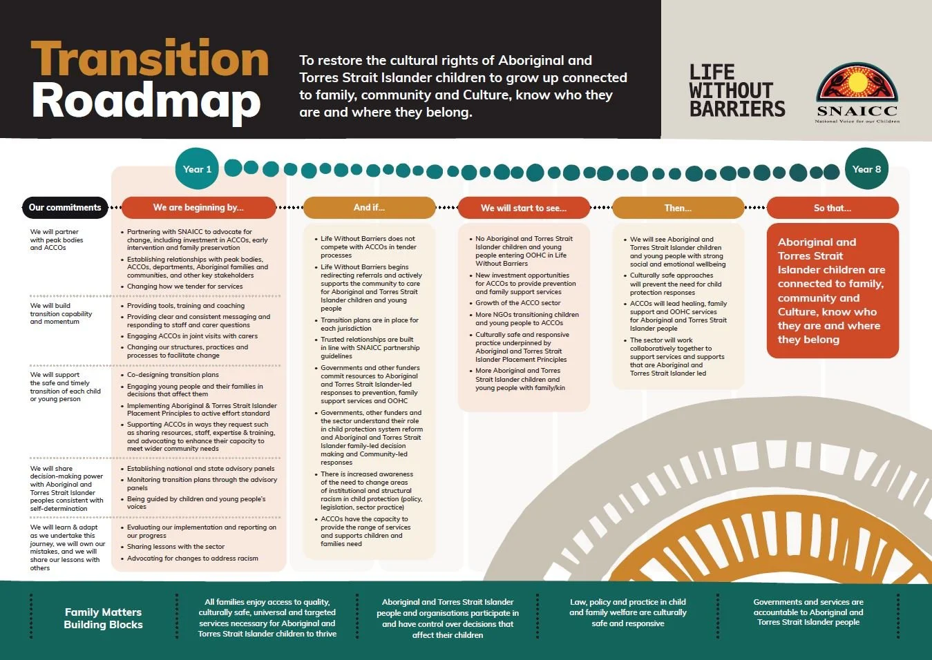 A sample transition roadmap to restore the cultural rights of Aboriginal and Torres Strait Islander children, young people and families through community informed child protection reform.